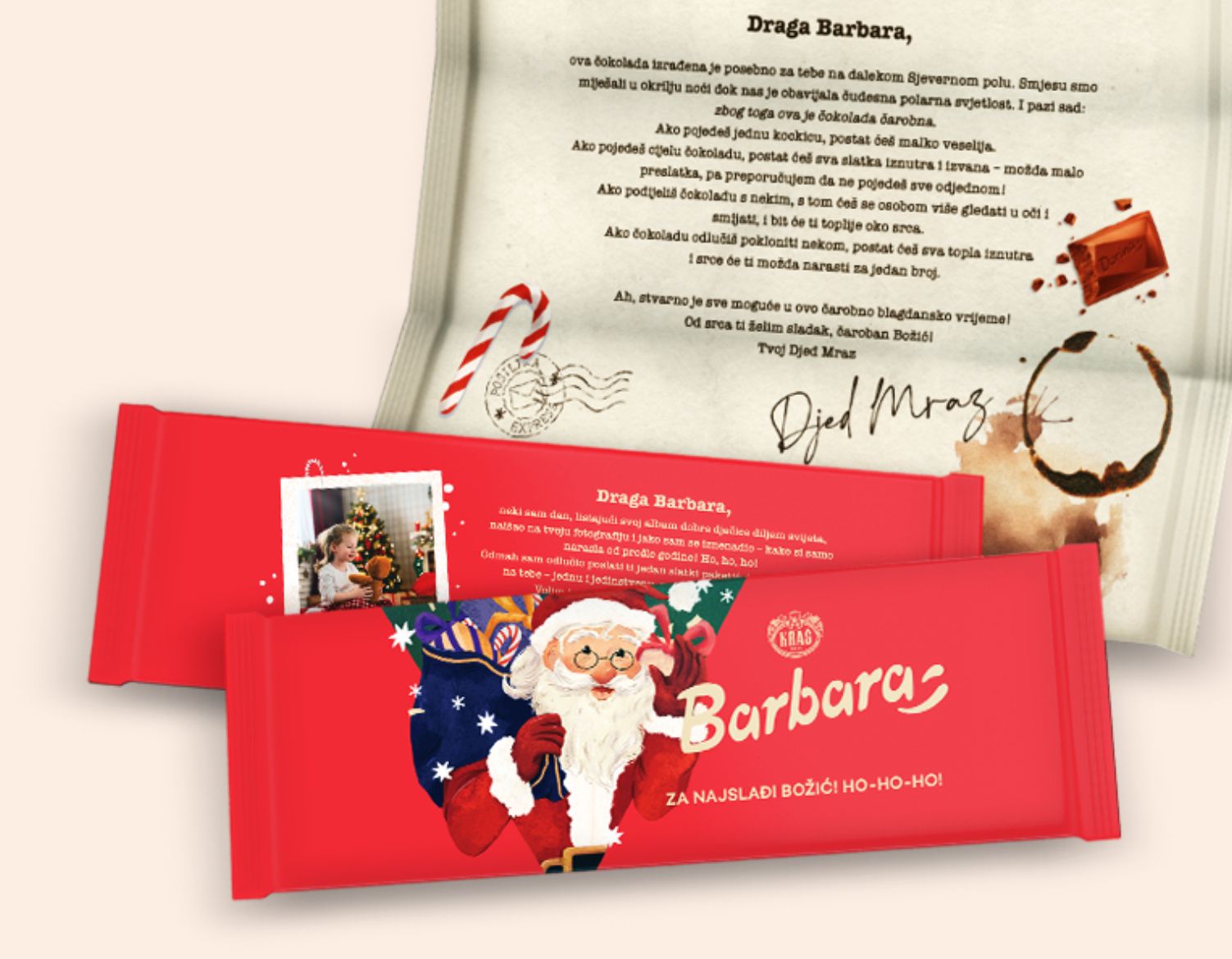 Za mališane koji su svoja pisma poslali Djedici, a sada s uzbuđenjem otkrivaju da im je on odlučio pisati natrag! Personalizirana Dorina čokolada “Za najslađi Božić! HO-HO-HO!” stiže izravno iz Djedičine radionice, a ispod čarobnog omota skriva se pravo božićno čudo – pismo koje je Djed Mraz napisao baš njemu!